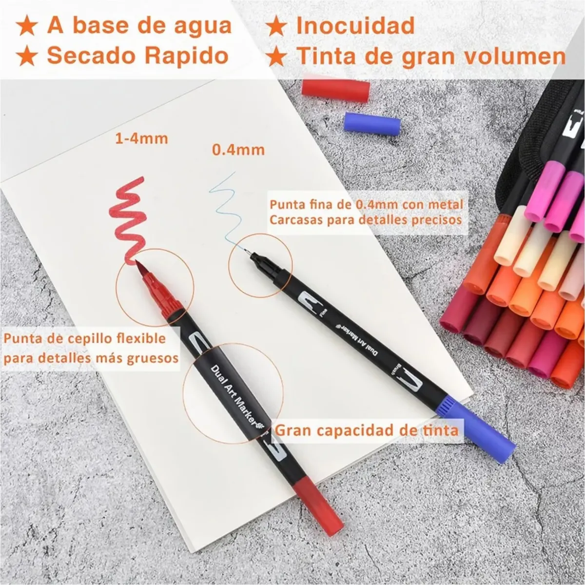 Su tinta a base de agua garantiza una aplicación suave y vibrante sobre papel, ideal para ilustraciones, bocetos y proyectos creativos.