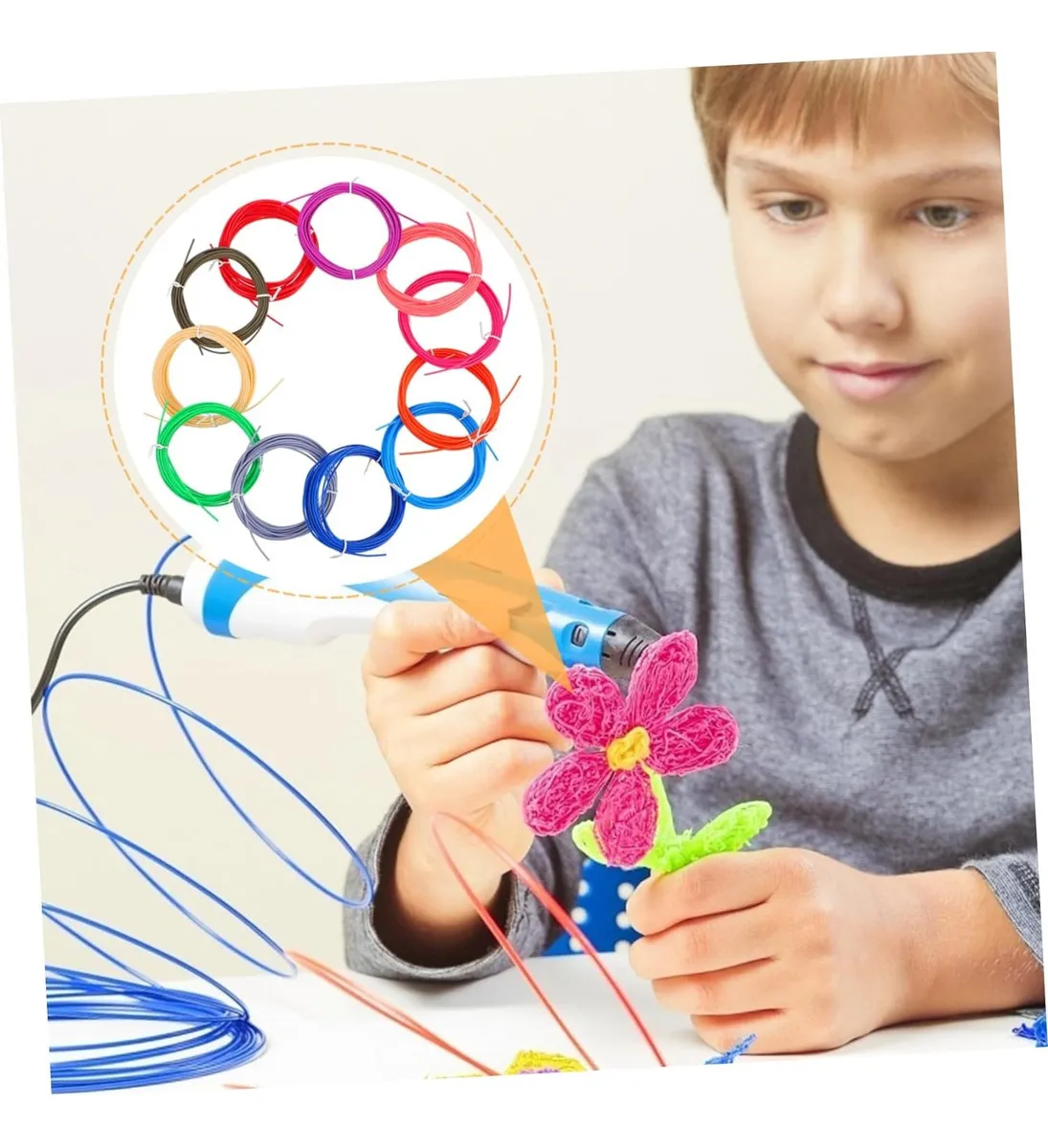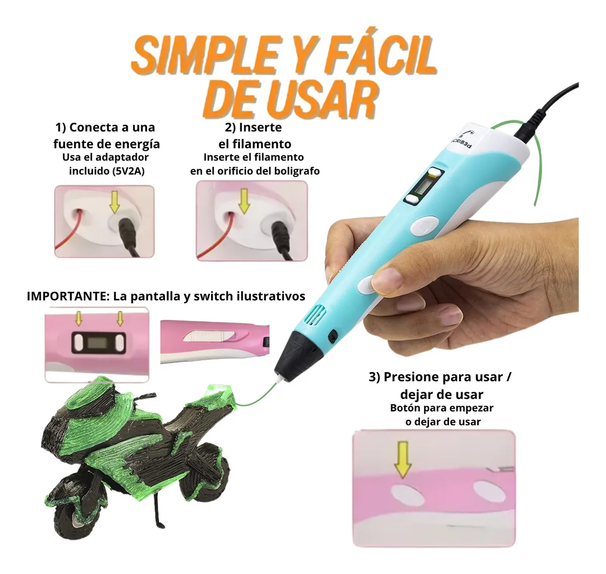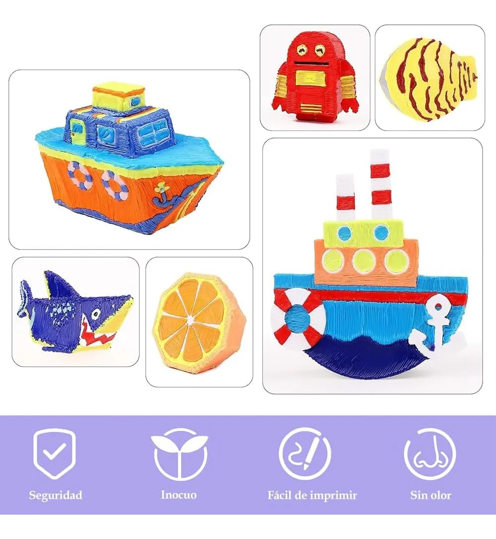 Lápiz 3D Profesional Pantalla OLED – Dibujo en 3D para Manualidades y Proyectos Creativos Este lápiz 3D permite crear figuras tridimensionales en el aire, dibujar en relieve sobre papel y construir objetos reales con filamentos PLA o ABS. Es una herramienta ideal para niños desde 8 años, estudiantes, artistas o cualquier persona que quiera dar vida a diseños, maquetas, reparaciones o manualidades de forma fácil y divertida. La versión actualizada incorpora pantalla OLED, control preciso de temperatura, modo de trazo continuo y alimentación por USB o powerbank, lo que garantiza un uso más cómodo, seguro y estable comparado con modelos tradicionales. Características principales • Pantalla OLED clara para ajustar temperatura y visualizar modo de trabajo • Compatible con filamentos PLA y ABS de uso estándar • Rango de temperatura regulable entre 130 °C y 235 °C • Función de dibujo continuo para trazos largos sin esfuerzo • Diseño ergonómico ultraliviano de solo 65 g • Base de apoyo protectora incluida • Alimentación por USB o powerbank 5V 2A (ideal para usar en cualquier lugar) • Sistema de seguridad con apagado automático a los 2 minutos • Medidas: 17.5 × 1.7 × 2 cm Beneficios • Construye objetos 3D reales en segundos • Estimula la creatividad, el aprendizaje y la motricidad fina • Ideal para maquetas, arte, decoración y manualidades • Permite reparar plásticos rotos o piezas pequeñas • Control preciso de temperatura para cada tipo de filamento • Modo continuo que evita cansancio en el dedo y mejora la precisión • Portátil: puede usarse en exteriores con powerbank Cómo usarlo Conectar a USB o powerbank Elegir la temperatura adecuada para PLA o ABS Esperar a que el lápiz alcance la temperatura Insertar el filamento en la parte posterior Presionar el botón para comenzar a dibujar en 3D Para trazo continuo, hacer doble clic en el botón Apoyar el lápiz en la base cuando no esté en uso Ideas de uso • Figuras completas: animales, personajes, letras, nombres • Maquetas escolares, arquitectura y proyectos STEM • Reparación de juguetes, piezas plásticas, tapas o soportes • Elaboración de adornos, colgantes, llaveros y accesorios • Decoración personalizada para fiestas o cuadernos • Creación de moldes, estructuras o patrones en papel • Actividades recreativas en escuelas, talleres y clubes